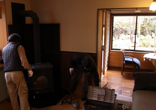 レッドさんと鉄庵が我家の暖房環境に処置を施し、薪ストーブを快適化してくれた。ふたりの息はぴったり!・・・・ではなく、文化祭の準備のような、ポリシーを投げ出しあう…