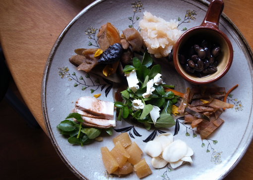 熊谷のミッチャんちで採れた黒豆名栗のオオキヒロコさんが栽培したカブマツシタテルミさんのつくったこんにゃく、夫婦でついたモチ横瀬のニンジン当番ヘルパーがおむつを取…