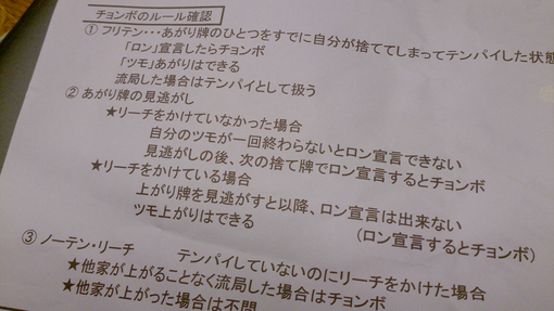 ちょんぼしたとき、慌てないためのルールが記されたプリントを発見。実にめんどくさい麻雀だ。そのうち麻雀にふさわしい服装やちょんぼしてもなじらない言葉遣いのルールも…