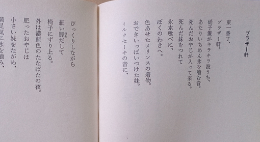 東一番丁、ブラザー軒。硝子簾がキラキラ波うち、あたりいちめん氷を噛む音。死んだおやじが入って来る。死んだ妹をつれて氷水喰べに、ぼくのわきへ。色あせたメリンスの着…