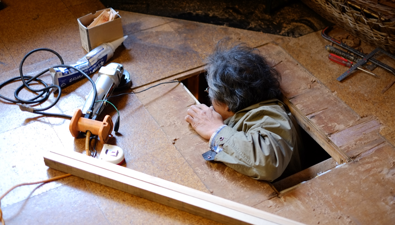 隠れ損ねた間男ではございません。26年間のハードユーズに堪え兼ねた我が家の床をなおしにいらした、T右官でございます。