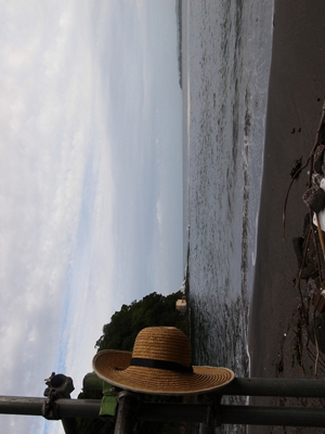 向こうに霞むは佃嵐埼と和田浜。おじさん仕様の麦わら帽子が、不自然な姿勢で沖を眺めてます。ちょうどこんなふうです。