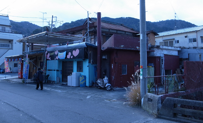 たぶん昔はガソリンスタンドだったんでしょうが、それからアジやイワシの干物屋さんになり、怪しいスナックになり、昼間からやってるカラオケやになり、どんどんわかんなくなってオーナーも出戻りの娘の代になってね(長男は都会へ行っちゃったのね)、ラブラブ系のパブになり、棄てるに棄てられない木製ドアを活かして住居になり、もてあましてたスペースを活かし貸間も始め、コンニチに至ると・・・・。
