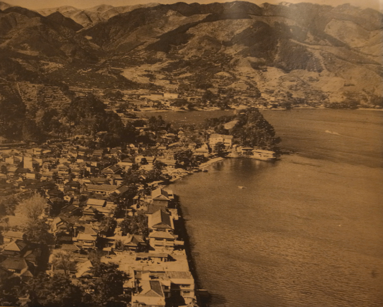 旅館からの眺望はこんなでわるくないです。水もきれいでゲージュツ的です。ワタシが生まれた頃は漁村に毛がはえたような、目も手足もいきとどく、身のタケにあった観光事業だったようで、こんな感じ。やがて高度成長時代に突入し、浮かれに浮かれてめちゃめちゃになっていくんですね。