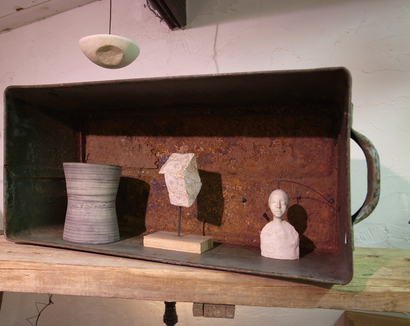 我家に泊まりに来て、コンビニも街路灯もない村内を面白がりモンシロチョウのように乱れ舞って帰っていった。ワタシの青春時代の想い出のしみ込んだジーパンを欲しがり、そのお礼にと後日くれたのがこの石けん入れだ。浮世絵らしき絵に石鹸の文字が添えられた、若さ丸出しのヤキモノで気に入ってる。あの日以来一度も彼と会っていないが、陶芸家をめざして修行し、いいマネージャー(ワイフ)もついて積極的に活動しているらしい。 そんな彼から東松山のギャラリーで展示即売会をやる旨の案内状が来た。石鹸入れがこんな繊細な皿になっていた。遊びの精神は相変わらずでこんなオブジェも。